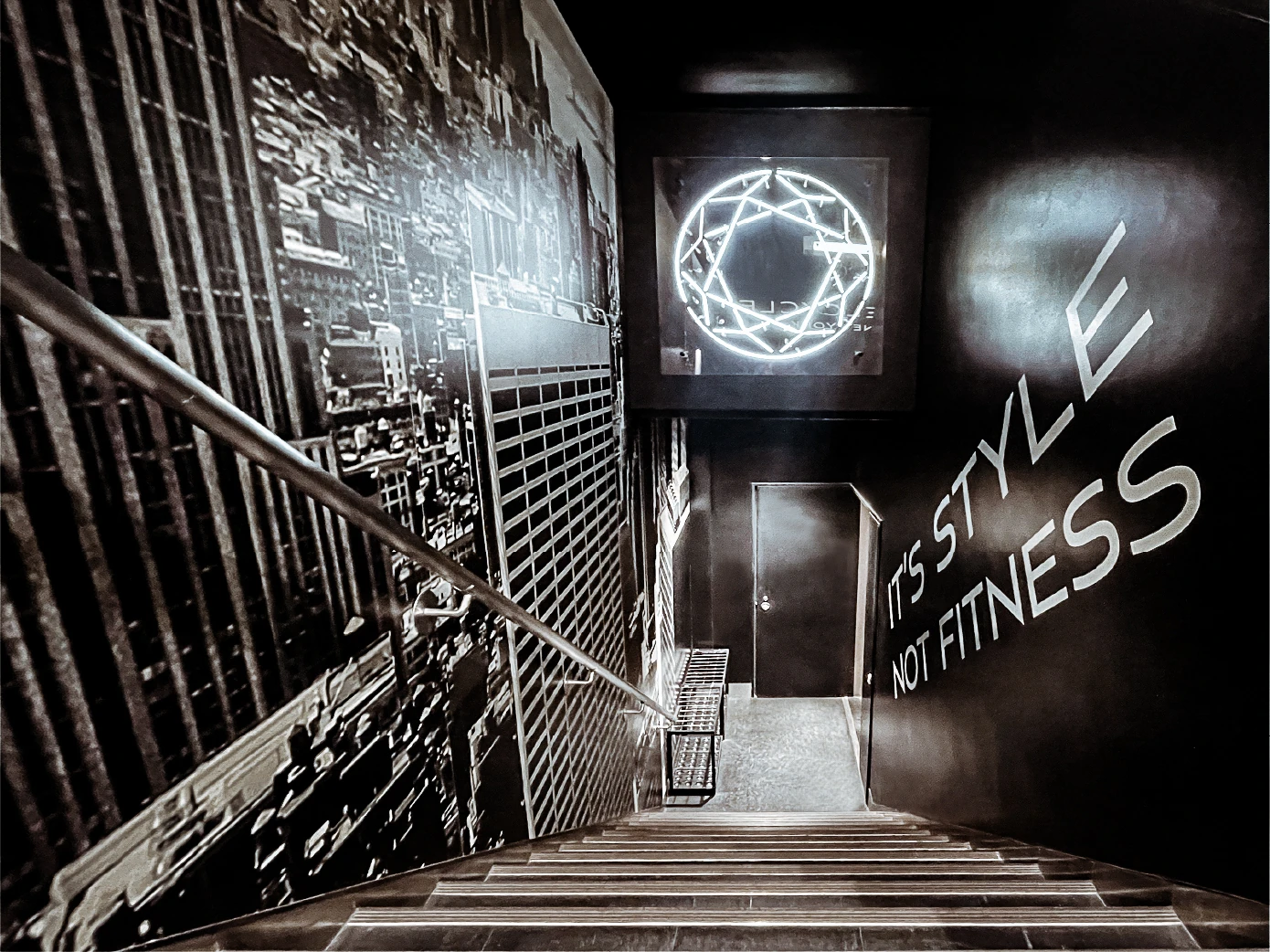 - E9出口を出て正面の、1Fにセブンイレブン・2FにムラサキスポーツがあるビルのB1Fです。